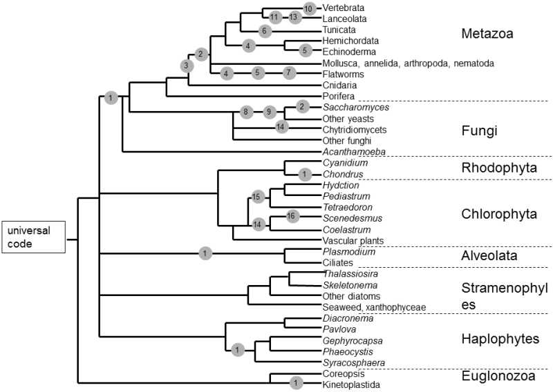 Fig. X.9. Changes in the mitochondrial genetic code during the phylogenesis of eukaryotes. While respecting the principle of maximum parsimony, the individual changes in the mitochondrial genetic code were located on the phylogenetic tree of the eukaryote formed on the basis of the sequence of genes for rRNA. It is apparent from the locations of the individual evolutionary events that some changes must have occurred repeatedly. Meaning of the individual evolutionary events: 1 –UGA stop → Trp, 2 – AUA Ile → Met, 3 – AGA, AGG Arg → Ser, 4 – AUA Met → Ile, 5 – AAA Lys → Asn, 6 – AGA, AGG Ser → Gly, 7 – UAA stop → Tyr, 8 – CUN (kde N = U, C, A, G) Leu → Thr, 9 – CGN Arg → ?, 10 – AGA, AGG ? → stop, 11 – AGA ? → Gly, 12 – AGA, AGG Ser → ?, 13 – AGA ? → Ser, 14 – UAG stop → Leu, 15 – UAG stop → Ala, 16 – UCA Ser → stop. The rooting of the phylogenetic tree must be seen as only provisional; according to some authors, the root of the phylogenetic tree of eukaryotes is located in a different place and the overall topology can still undergo substantial changes. Modified according to Knight et al. (2001).