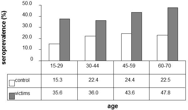 Fig. XIX.17 Greater fraction of persons infected by the protozoa Toxoplasma gondii amongst the victims of traffic accidents compared with the general population. The frequency of toxoplasmosis amongst participants in traffic accidents (drivers and pedestrians) in the territory of inner Prague was compared with the frequency of toxoplasmosis in a control set of persons with permanent residence in the same area. It was found from the difference in the two frequencies that persons with toxoplasmosis have an approximately 2.6-fold greater risk of an accident that uninfected persons. Because the relative risk of an accident is correlated with the level of specific antitoxoplasmotic antibodies, it is probable that toxoplasmosis is the actual cause of the increased risk of accidents amongst infected persons. Simultaneously, it is not clear whether the greater risk of traffic accidents is caused by changes in the psychological profile of infected persons or prolonging of their reaction time or their reduced concentration ability (Havlicek et al. 2001). According to Flegr et al. (2002).