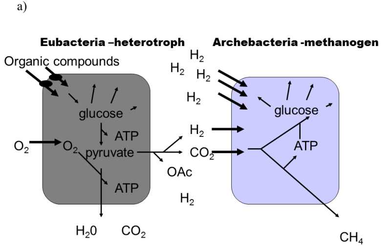 Fig. XVIII.3 Martin–Müller hydrogen hypothesis of the symbiotic formation of eukaryotic cells. According to this hypothesis, eukaryotic organisms developed in several stages from heterotrophic bacteria, emitting hydrogen into the environment as one of their waste products, and autotrophic archaebacteria, utilizing hydrogen from the environment to synthesize organic substances and emitting methane into the environment (a). In the first stage, a cell consortium was formed, in which eubacteria produced hydrogen and this was immediately used for their needs by archaebacteria. This freed archaebacteria from dependence on relatively rare sources of natural hydrogen (b). In the subsequent stage, partial endocytosis of the bacteria into the archaebacteria cells occurred. This state improved the utilization of hydrogen, as it was no longer capable of escaping into the environment. The archaebacteria began to utilize the other waste products of eubacterial metabolism to a greater degree.  However, the surface of the eubacterial cells continued to locally communicate with the external environment, from which they transported organic substances for their heterotrophic metabolism (c). The last stage in the evolution of the eukaryotic cells consisted in transferring molecular transporters for organic substances from the surface of the eubacteria to the surface of the archaebacteria and turning the direction of part of the metabolic pathway of the archaebacteria from anabolism to catabolism. As a result of these changes, it was possible to complete the internalization of the eubacterial cell which, since that time, began to obtain organic substances for its metabolism only indirectly from the archaebacterial cells. The archaebacterial cells ceased to provide the no-longer required hydrogen and, instead, began to provide ATP directly. This symbiosis permitted integration and improvement of the life processes of both symbionts through shifting the individual metabolic functions between the compartments of the original symbionts. As a consequence, both the mitochondria of most eukaryotic organisms, producing water and CO2 as waste products, and also the hydrogenosomes of some protozoa and fungi, producing organic acids and hydrogen as waste products (d), were formed from eubacteria. According to Martin and Müller (1998).