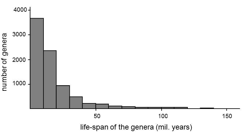 Fig. XXII.12 Survival of the individual genera of marine fauna. The graph was drawn up on the basis of 17,500 extinct genera of marine fauna (vertebrates, invertebrates and microfossils) (Sepkoski, 1989). A similar type of distribution (i.e. exponential distribution) is also obtained if the genera are studied in a specific phylogenetic line. The character of the distribution indicates that a species will become extinct with the same probability at any time after the beginning of its existence. According to Raup (1994).