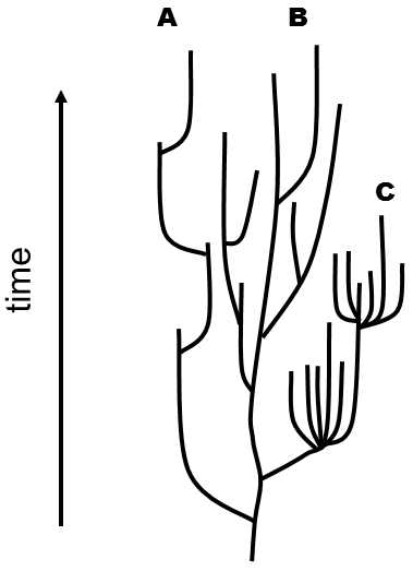 Fig. XXV.1 Topology of a phylogenetic tree. The cladogenesis of the various branches within a single phylogenetic line can differ substantially. Speciations occur rarely in branch A, where the old species rapidly becomes extinct after the emergence of a new species. Speciation occurs randomly within any branch in branch B where, in some cases, the old species dies out first and, in other cases, the new species is the first to become extinct. Most of the species become extinct in branch C without even undergoing speciation; however, at a certain moment, radiation, i.e. rapid repeated splitting off of new species, occurs in some species.